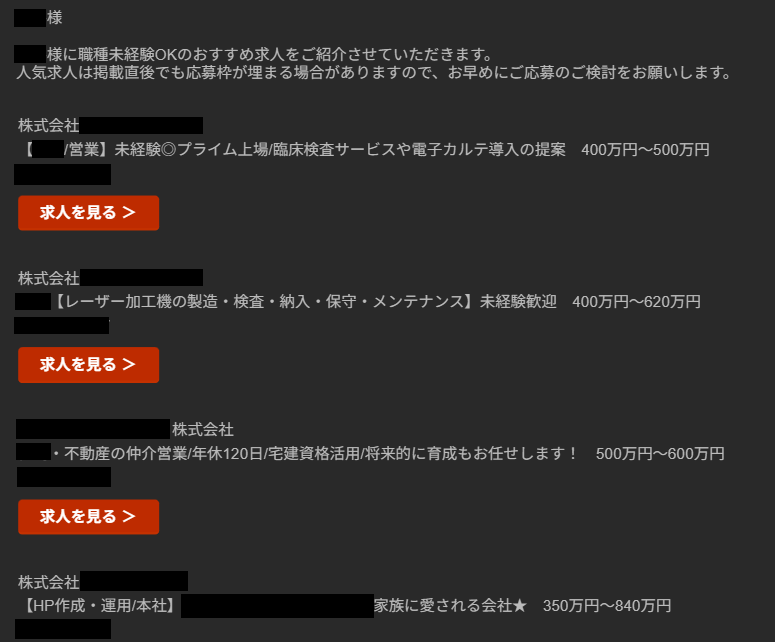ただ、定期的に送られてくるおすすめ求人メールは、AIがこちらの傾向をくみ取って送ってくるため、確かに「的外れ」かな?と思うこともありました。下図のようなメールが2日に1回ぐらいのペースで送られてきます。